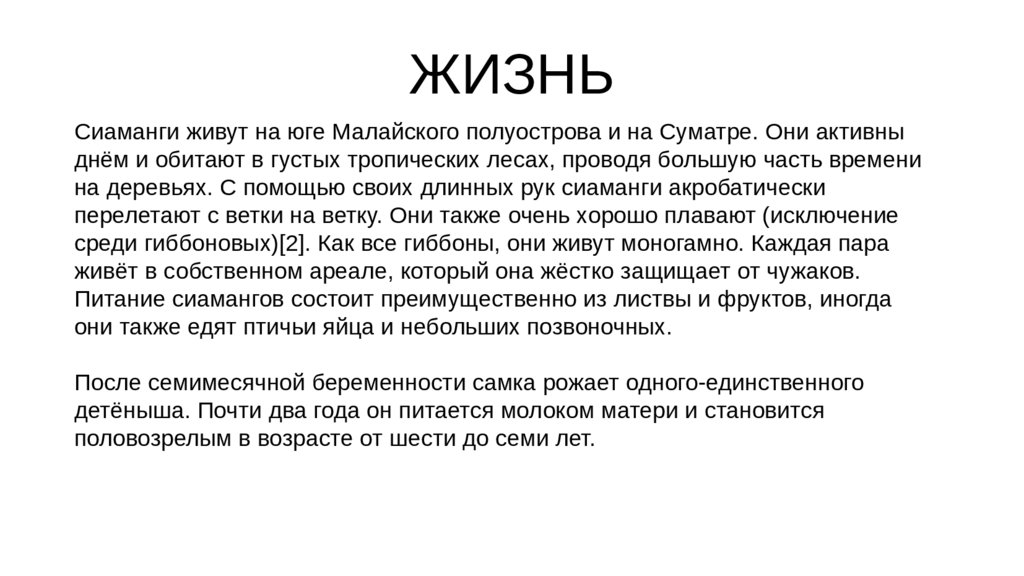 ЖИЗНЬСиаманги живут на юге Малайского полуострова и на Суматре. Они активны
