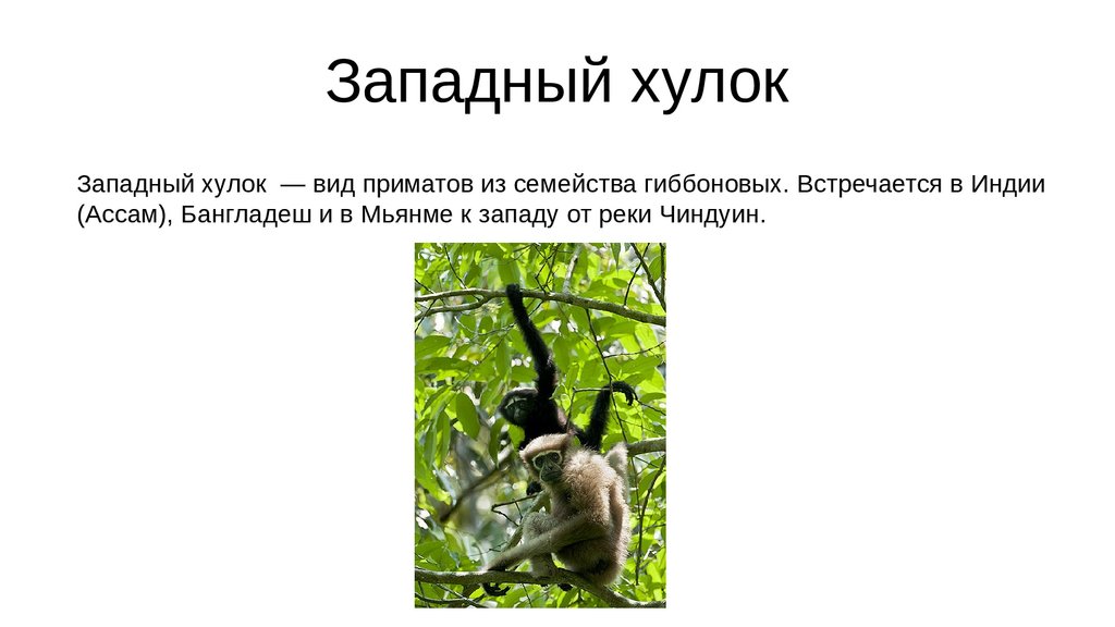 Западный хулокЗападный хулок — вид приматов из семейства гиббоновых. Встречается в Индии