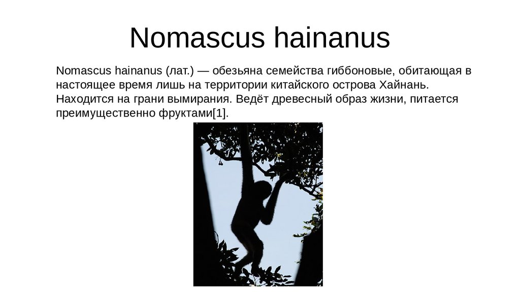 Nomascus hainanusNomascus hainanus (лат.) — обезьяна семейства гиббоновые, обитающая в