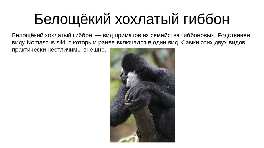 Белощёкий хохлатый гиббонБелощёкий хохлатый гиббон — вид приматов из семейства гиббоновых. Родственен