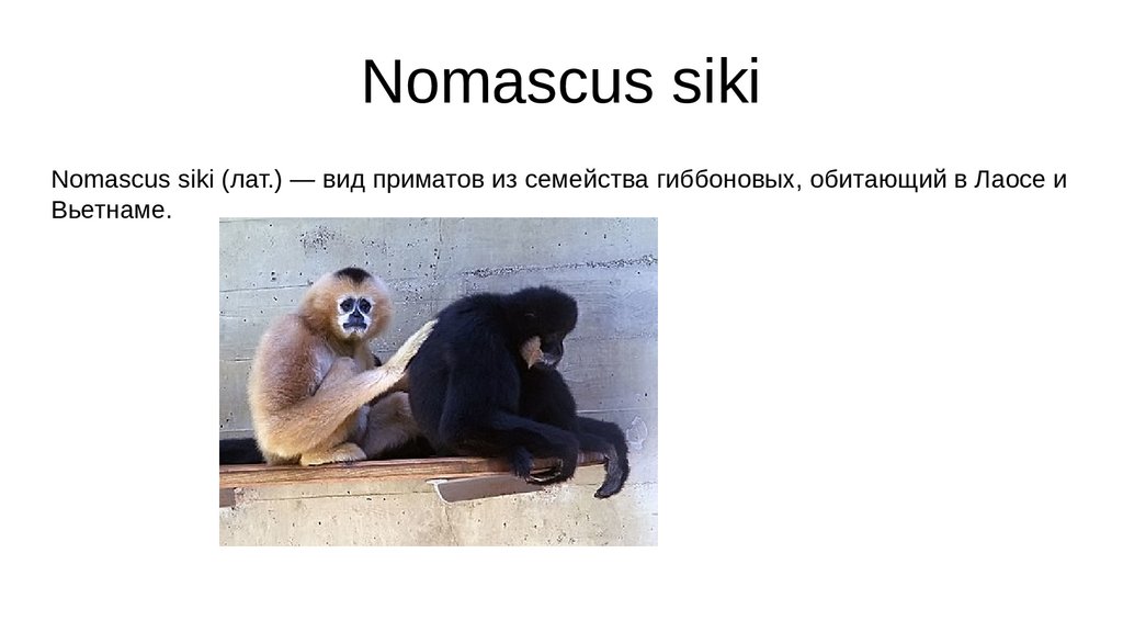 Nomascus sikiNomascus siki (лат.) — вид приматов из семейства гиббоновых, обитающий в Лаосе и