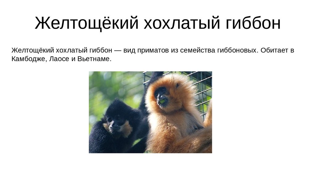 Желтощёкий хохлатый гиббонЖелтощёкий хохлатый гиббон — вид приматов из семейства гиббоновых. Обитает в