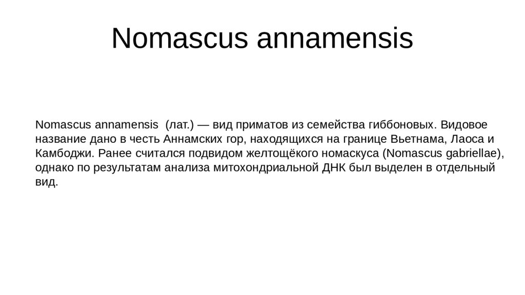Nomascus annamensisNomascus annamensis (лат.) — вид приматов из семейства гиббоновых. Видовое