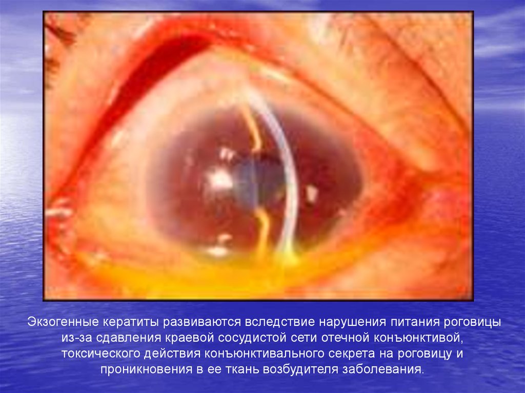 Экзогенные кератиты развиваются вследствие нарушения питания роговицыиз-за сдавления краевой сосудистой сети отечной конъюнктивой,