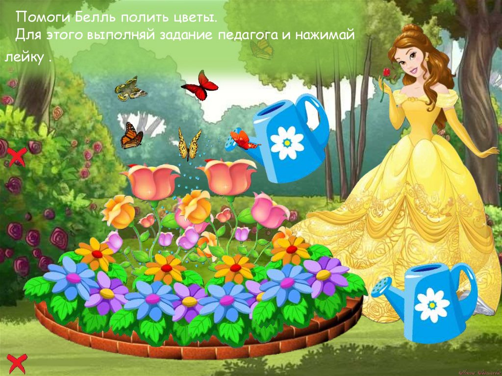 Помоги Белль полить цветы.Для этого выполняй задание педагога и нажимай