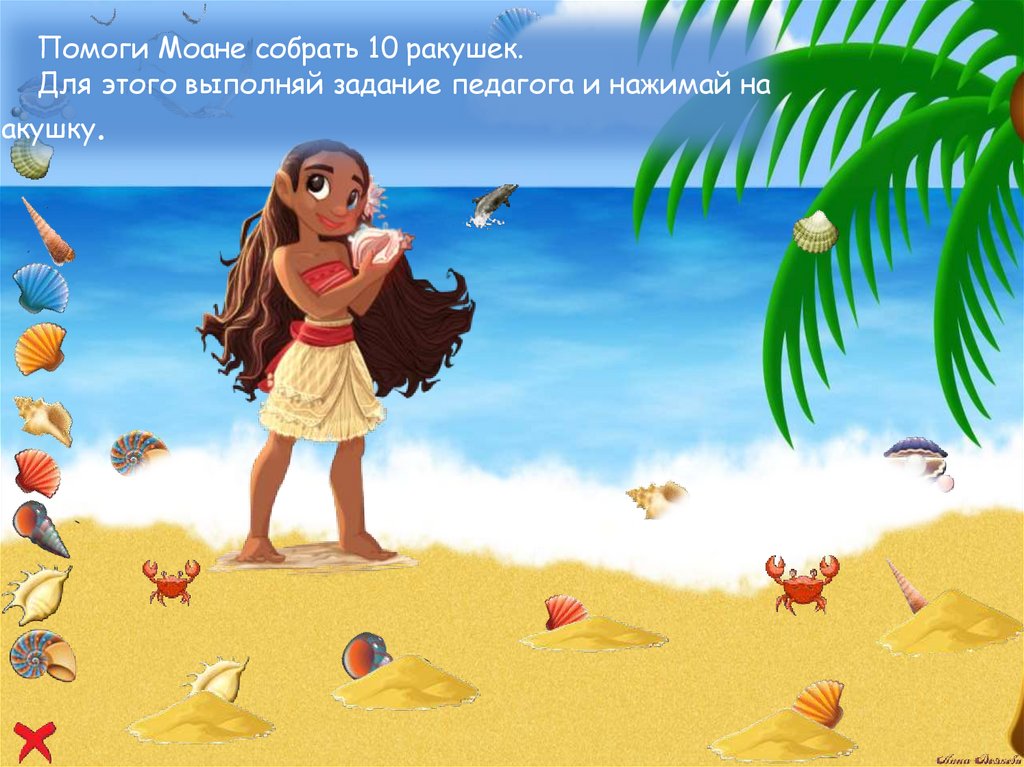 Помоги Моане собрать 10 ракушек.Для этого выполняй задание педагога и нажимай на