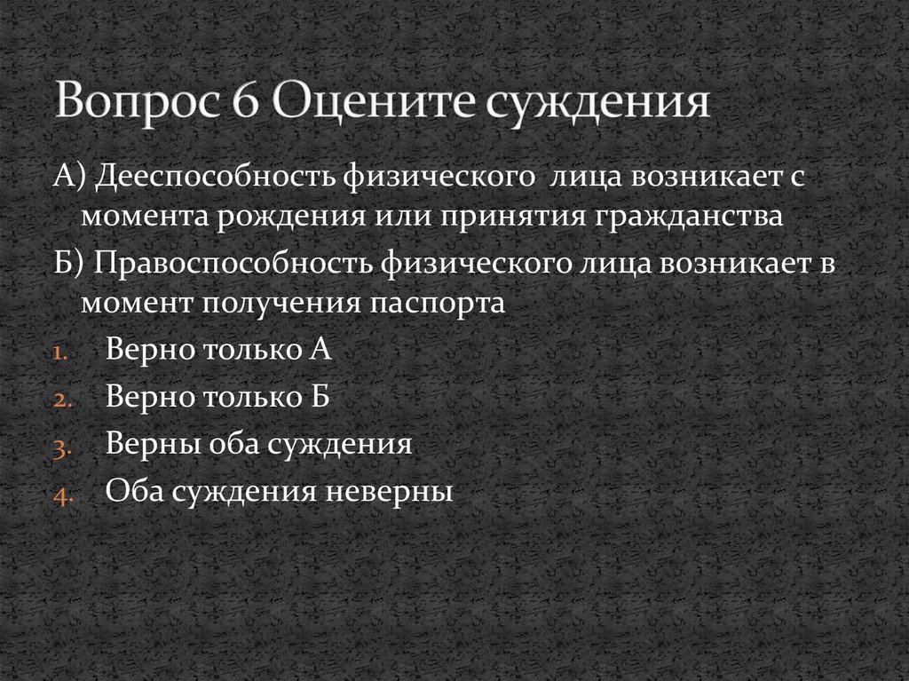 А) Дееспособность физического лица возникает смомента рождения или принятия гражданства