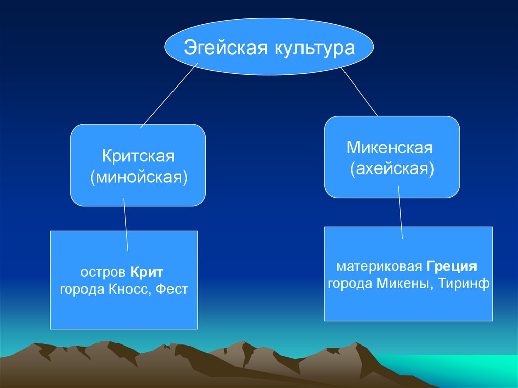 • Эгейская, или Крито-микенская культурасуществовала в бассейне Эгейского