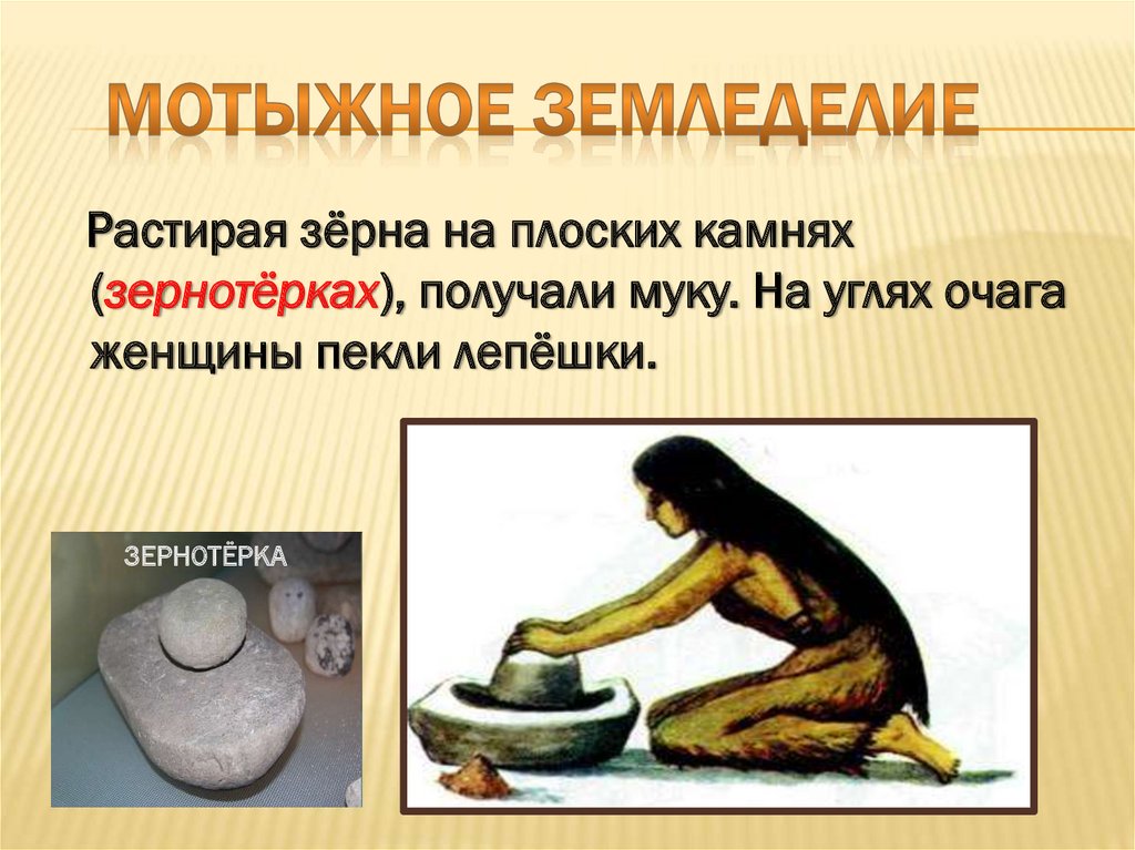 Растирая зёрна на плоских камнях(зернотёрках), получали муку. На углях очага
