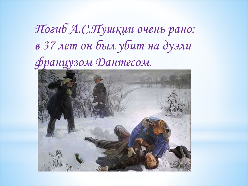 Погиб А.С.Пушкин очень рано:в 37 лет он был убит на дуэли