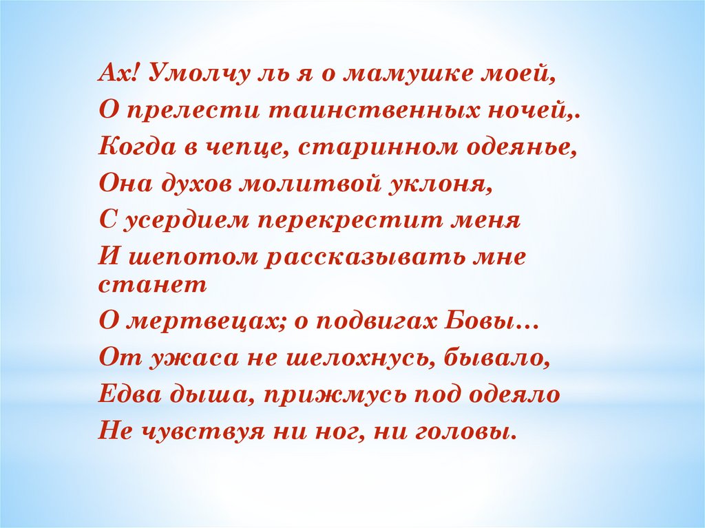 Ах! Умолчу ль я о мамушке моей,О прелести таинственных ночей,.