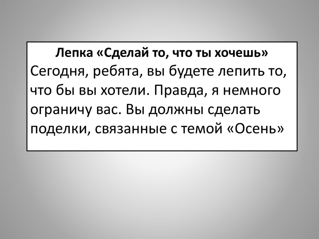 Лепка «Сделай то, что ты хочешь»Сегодня, ребята, вы будете лепить то,