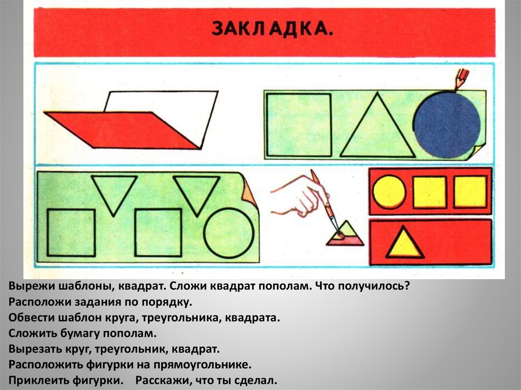 Вырежи шаблоны, квадрат. Сложи квадрат пополам. Что получилось?Расположи задания по порядку.