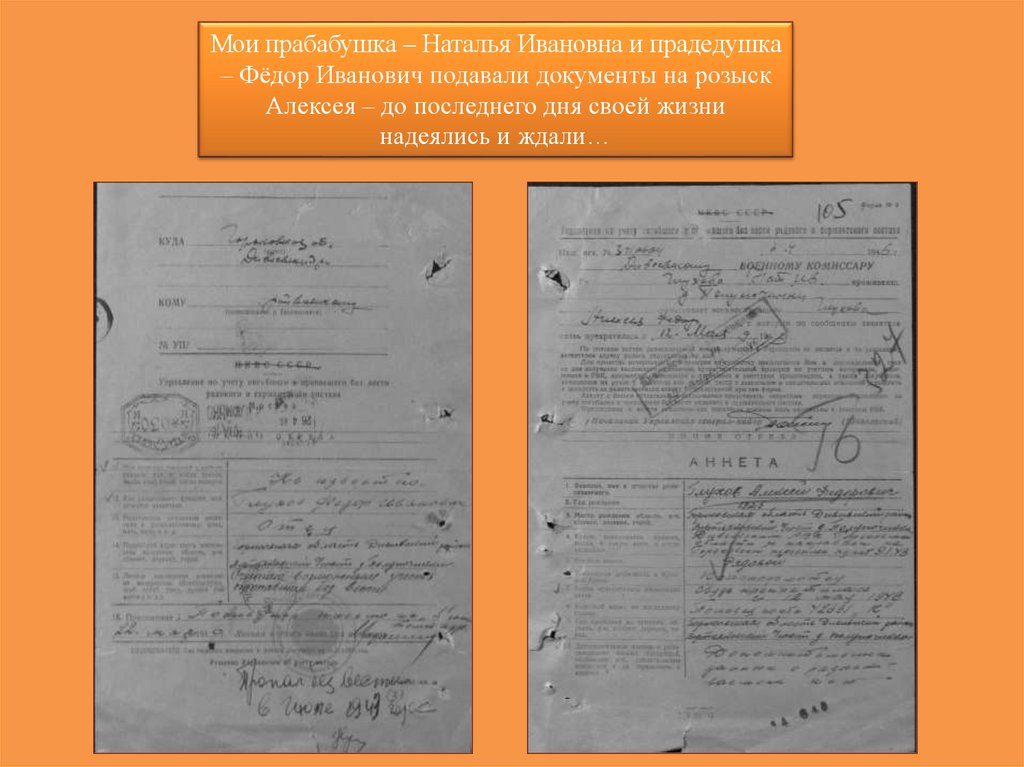 Мои прабабушка – Наталья Ивановна и прадедушка– Фёдор Иванович подавали документы на розыск
