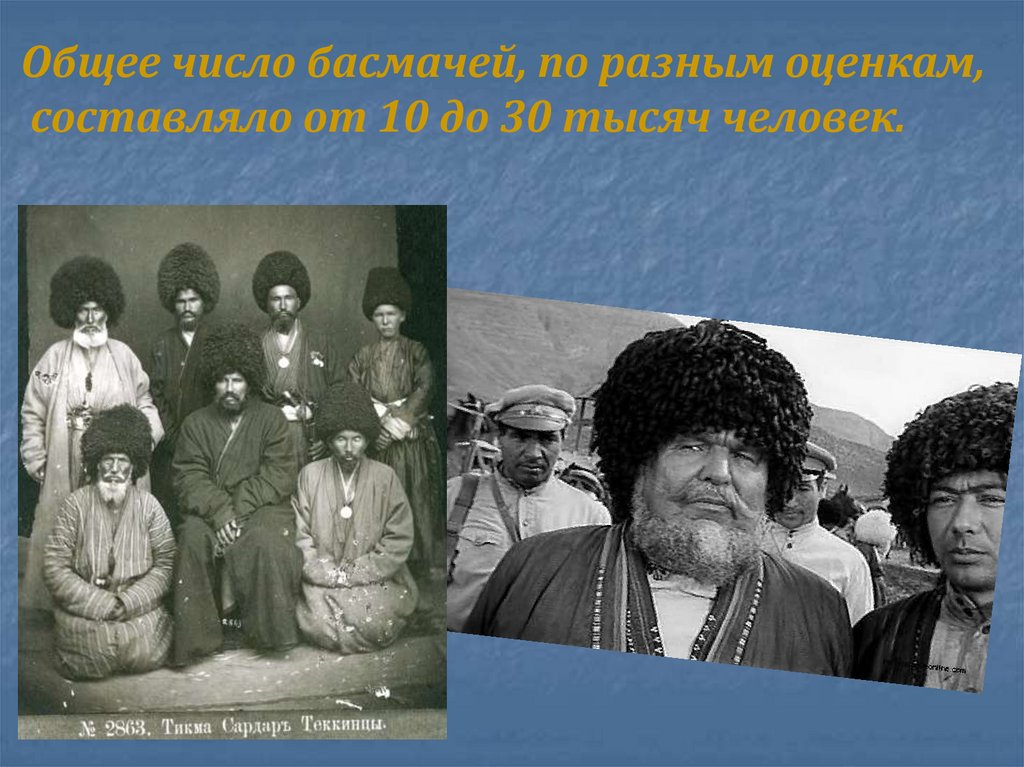 Общее число басмачей, по разным оценкам,составляло от 10 до 30 тысяч человек.