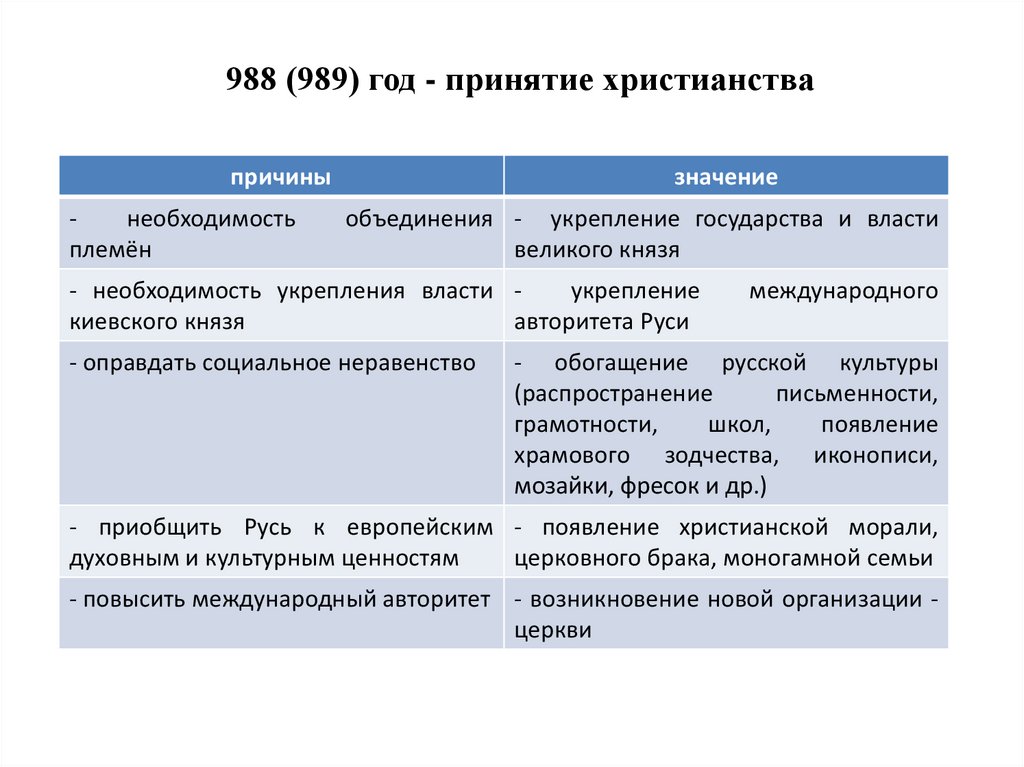 - приобщить Русь к европейским - появление христианской морали,
