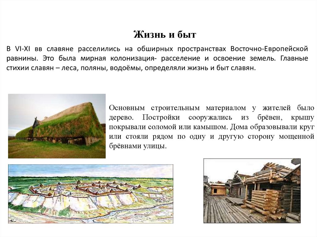 Жизнь и бытВ VI-XI вв славяне расселились на обширных пространствах Восточно-Европейской