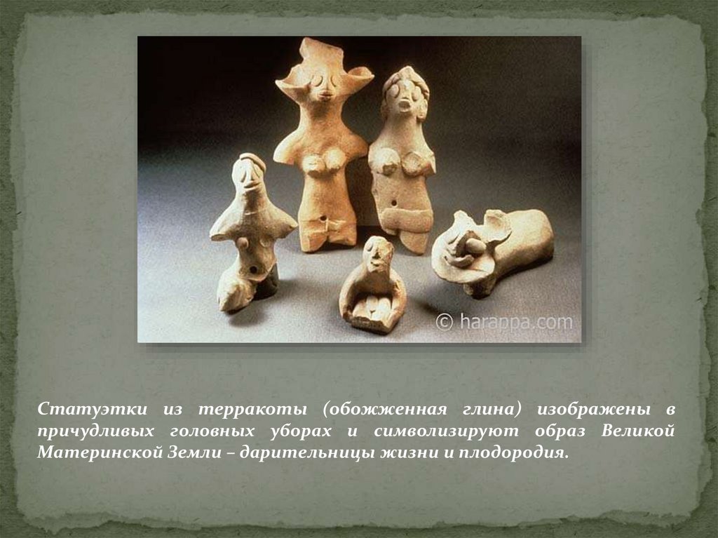 Статуэтки из терракоты (обожженная глина) изображены впричудливых головных уборах и символизируют образ Великой