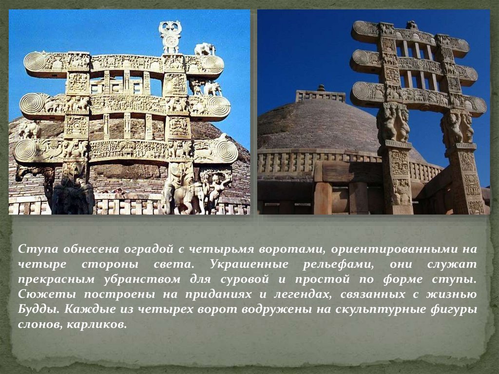 Ступа обнесена оградой с четырьмя воротами, ориентированными начетыре стороны света. Украшенные рельефами, они служат