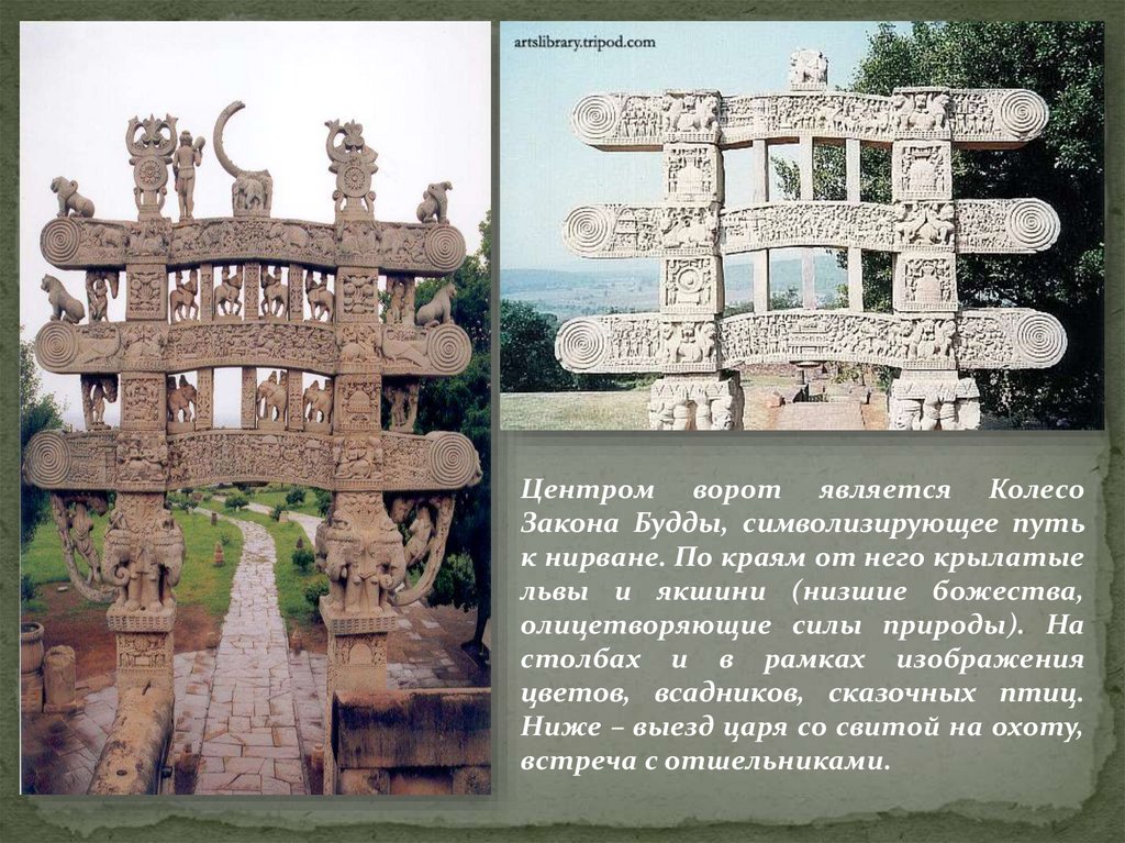 Центром ворот является КолесоЗакона Будды, символизирующее путь