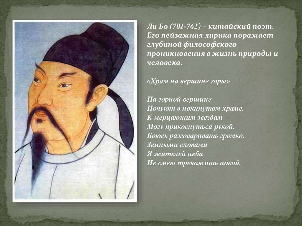 Ли Бо (701-762) – китайский поэт.Его пейзажная лирика поражает