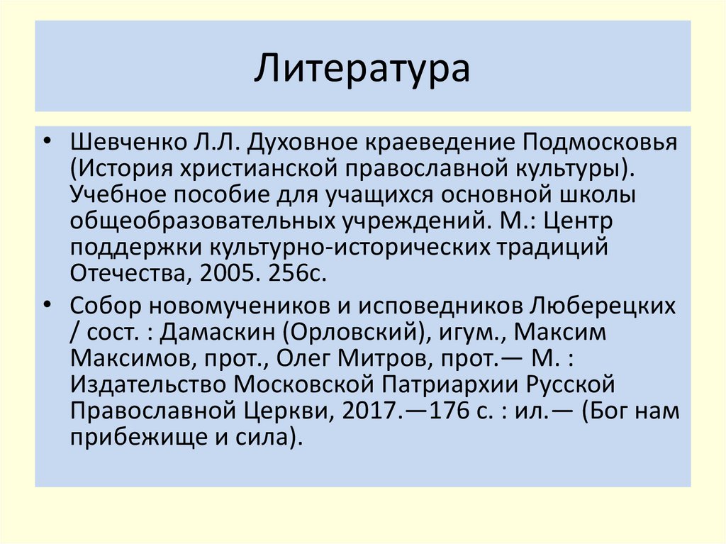 Литература• Шевченко Л.Л. Духовное краеведение Подмосковья