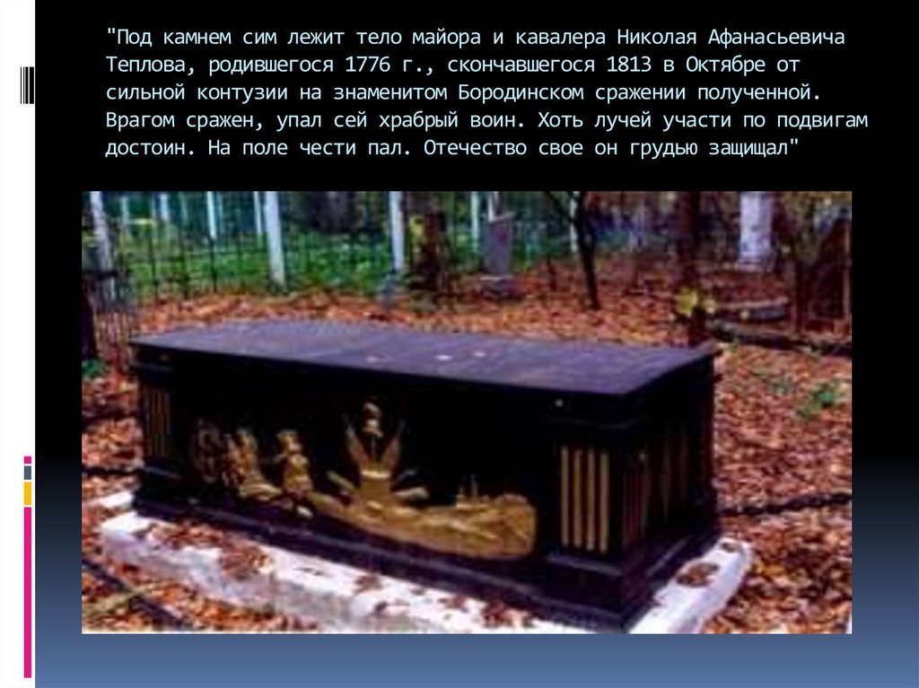"Под камнем сим лежит тело майора и кавалера Николая АфанасьевичаТеплова, родившегося 1776 г., скончавшегося 1813 в Октябре от