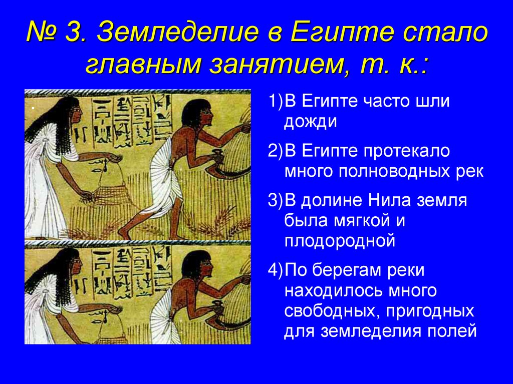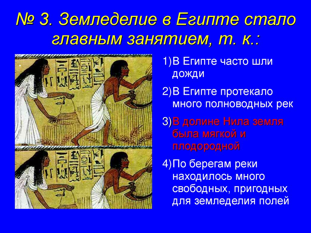 № 3. Земледелие в Египте сталоглавным занятием, т. к.: