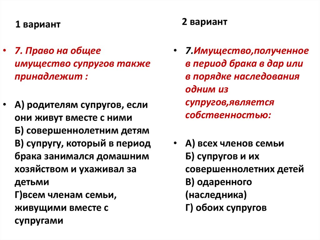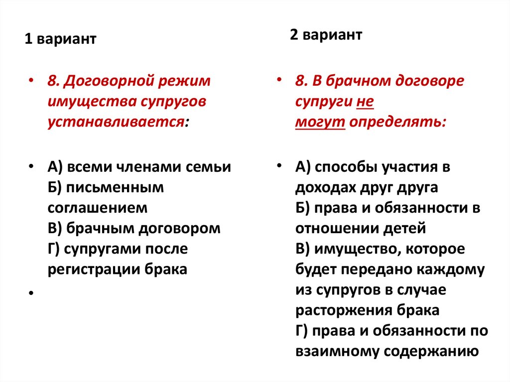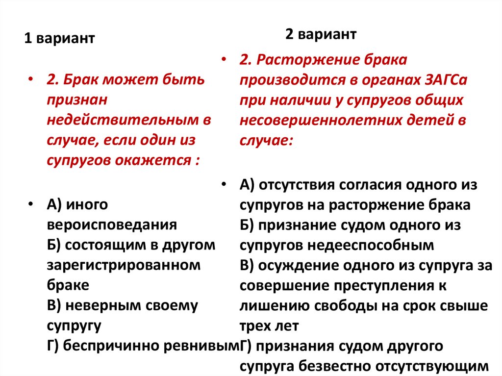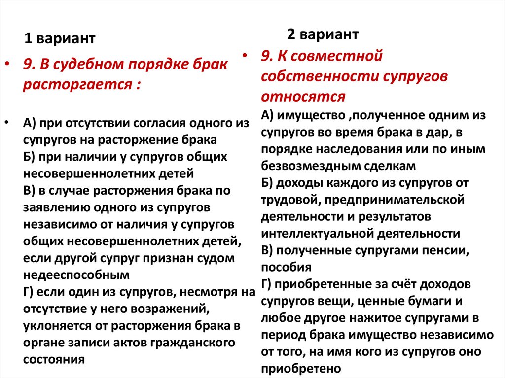 2 вариант• 9. В судебном порядке брак • 9. К совместной
