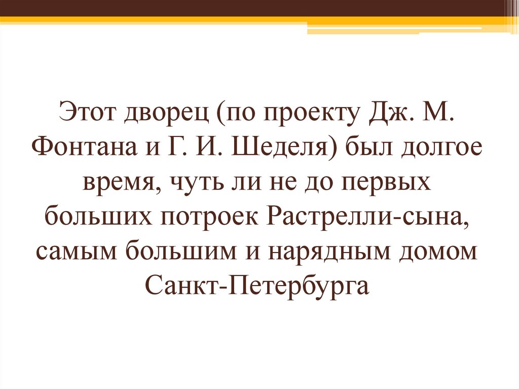 Этот дворец (по проекту Дж. М.Фонтана и Г. И. Шеделя) был долгое