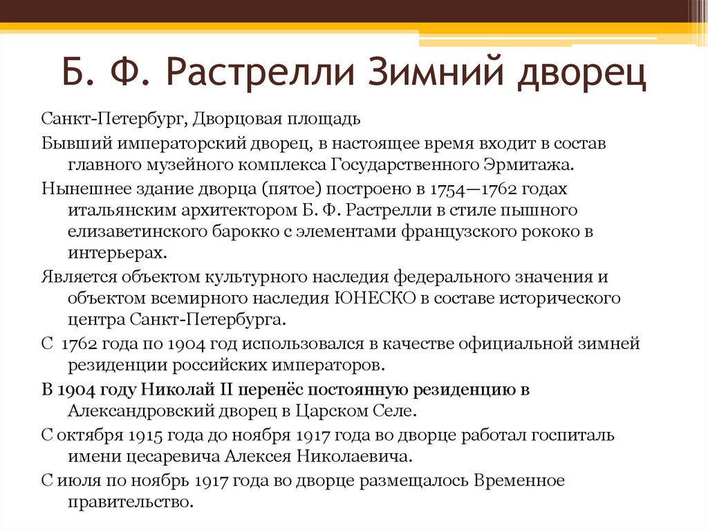 Б. Ф. Растрелли Зимний дворецСанкт-Петербург, Дворцовая площадь