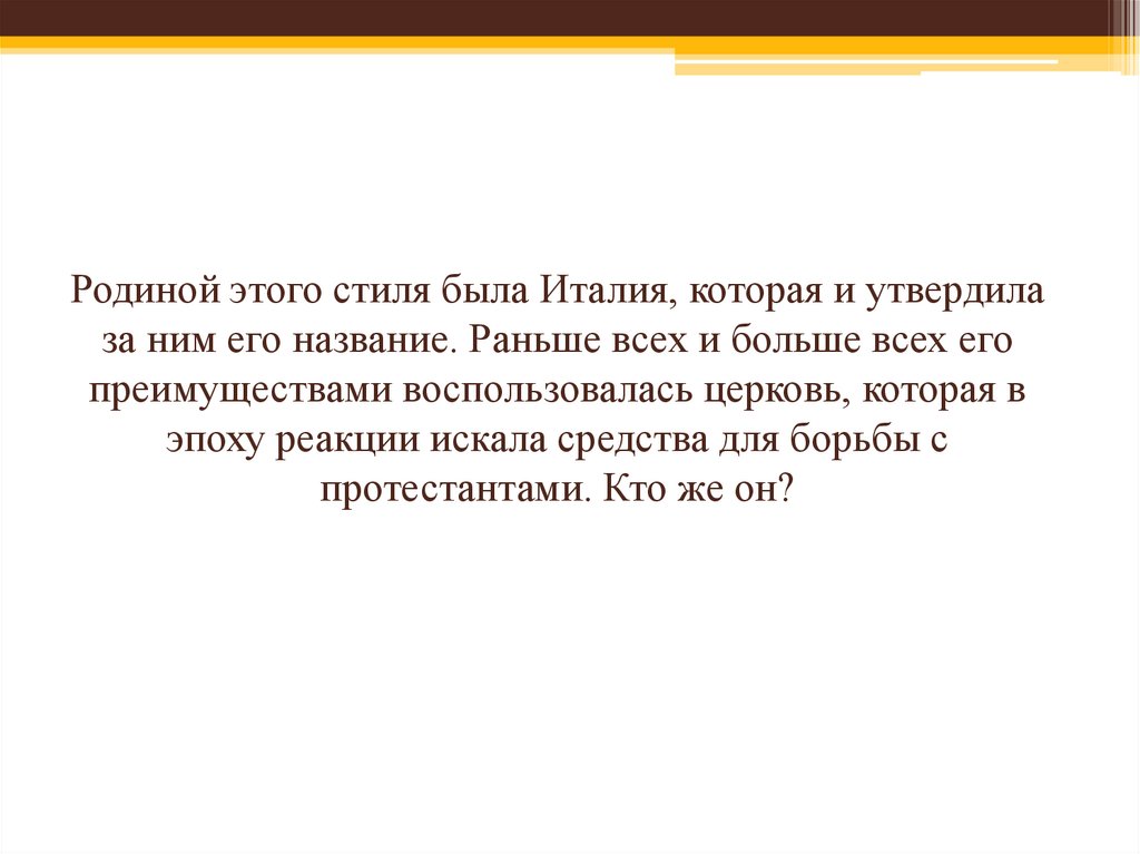 Родиной этого стиля была Италия, которая и утвердилаза ним его название. Раньше всех и больше всех его