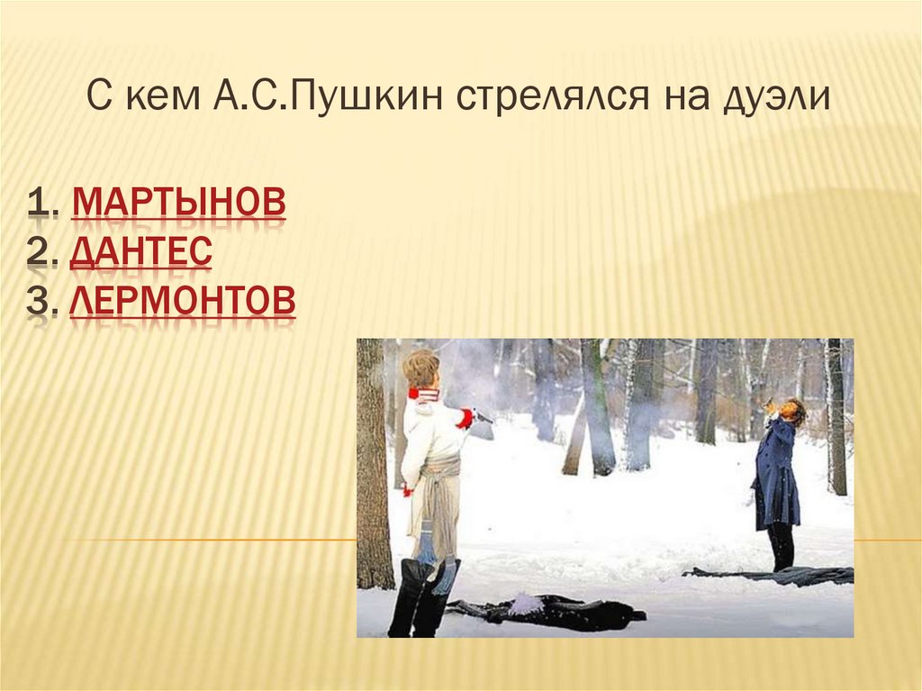 С кем А.С.Пушкин стрелялся на дуэли1. МАРТЫНОВ