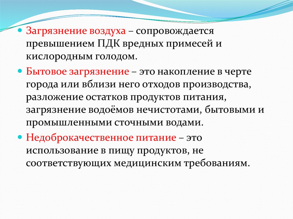 Загрязнение воздуха – сопровождаетсяпревышением ПДК вредных примесей и