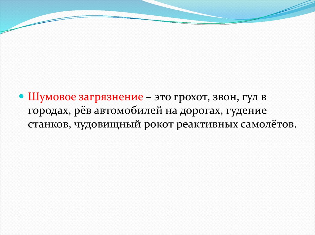 Шумовое загрязнение – это грохот, звон, гул вгородах, рёв автомобилей на дорогах, гудение