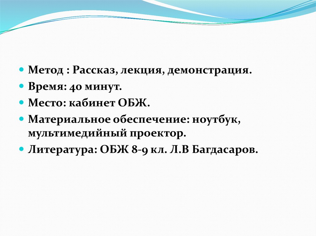 Литература: ОБЖ 8-9 кл. Л.В Багдасаров.