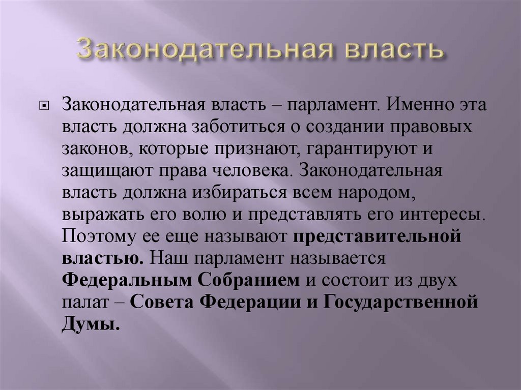 Законодательная власть – парламент. Именно этавласть должна заботиться о создании правовых
