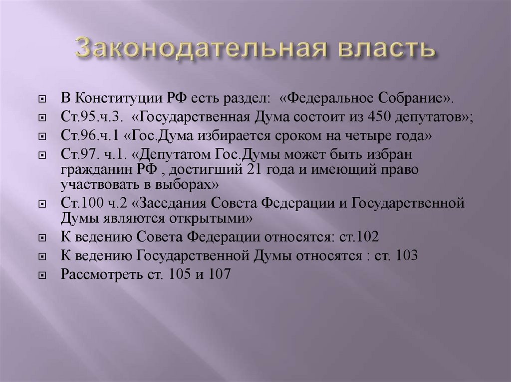 В Конституции РФ есть раздел: «Федеральное Собрание».Ст.95.ч.3. «Государственная Дума состоит из 450 депутатов»;