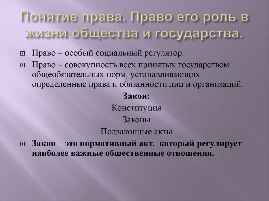 Право – особый социальный регулятор.Право – совокупность всех принятых государством