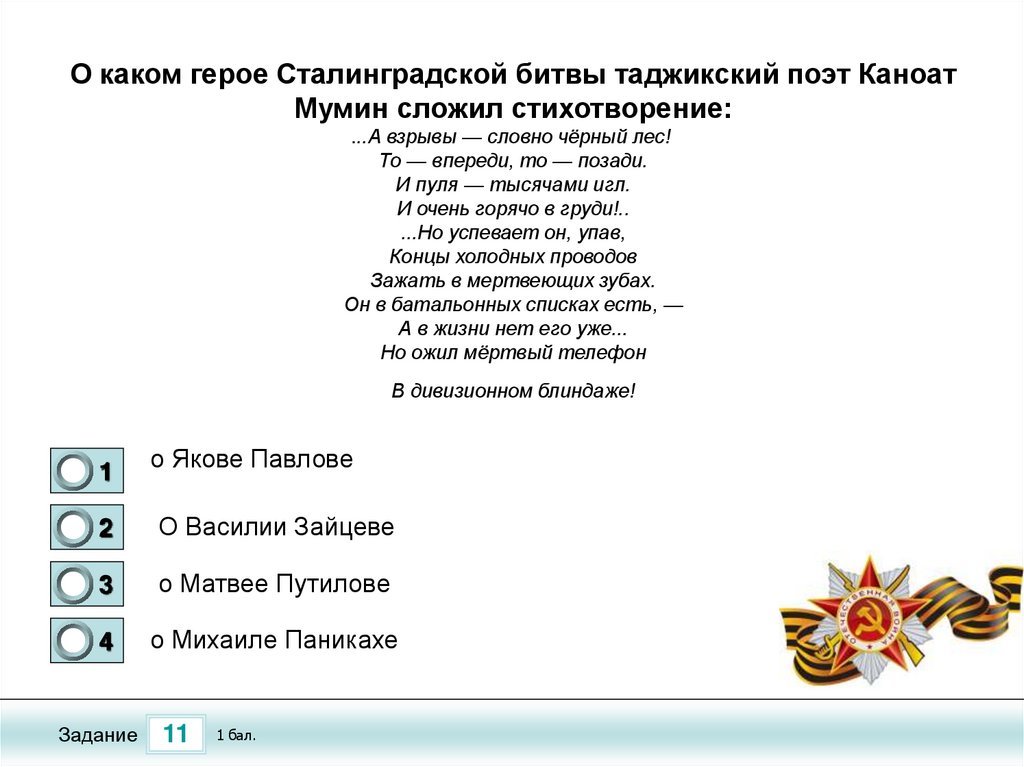 О каком герое Сталинградской битвы таджикский поэт КаноатМумин сложил стихотворение: