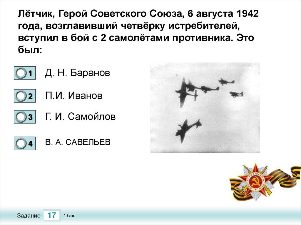 Лётчик, Герой Советского Союза, 6 августа 1942года, возглавивший четвёрку истребителей,