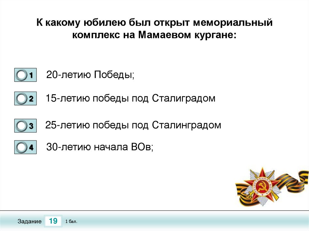 К какому юбилею был открыт мемориальныйкомплекс на Мамаевом кургане: