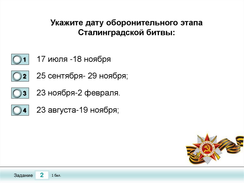 Укажите дату оборонительного этапаСталинградской битвы: