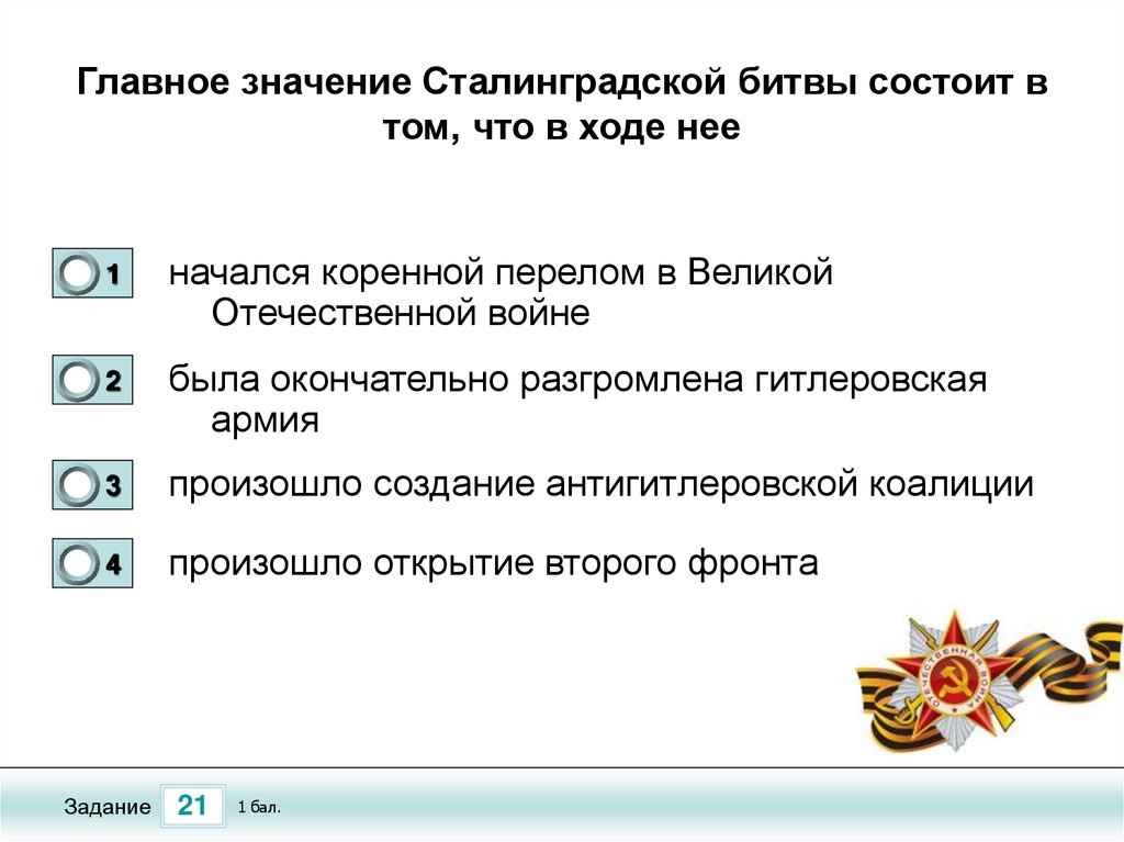 Главное значение Сталинградской битвы состоит втом, что в ходе нее