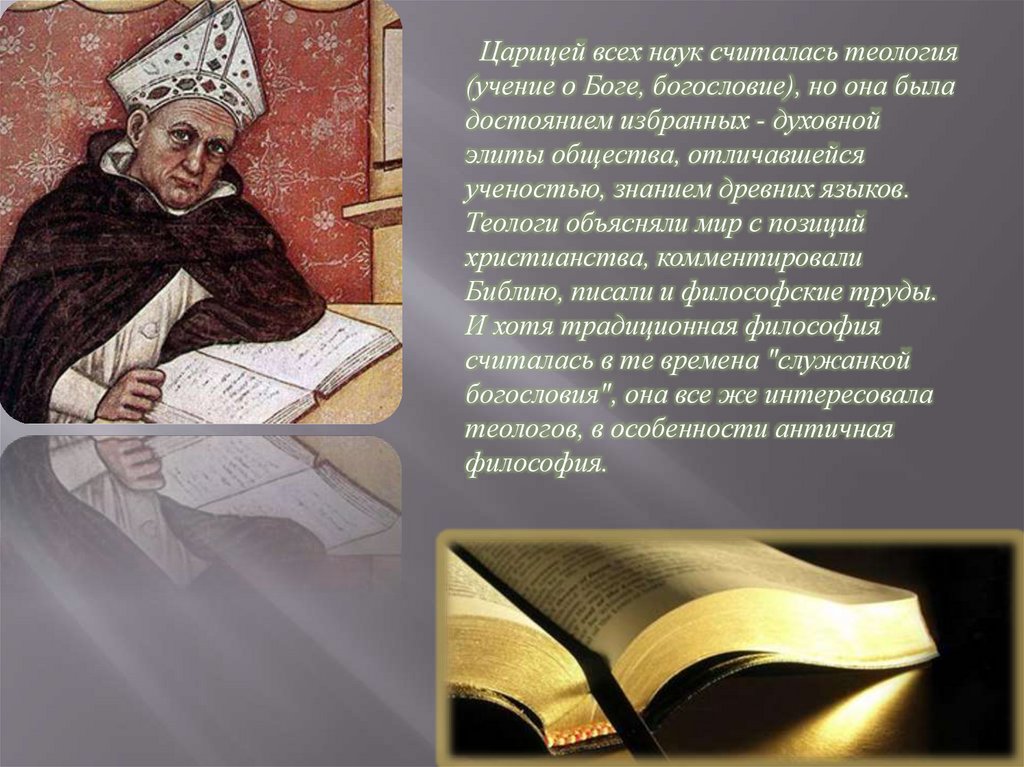 Царицей всех наук считалась теология(учение о Боге, богословие), но она была