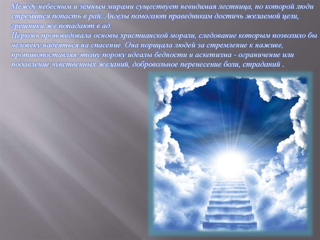 Между небесным и земным мирами существует невидимая лестница, по которой людистремятся попасть в рай. Ангелы помогают праведникам достичь желаемой цели,