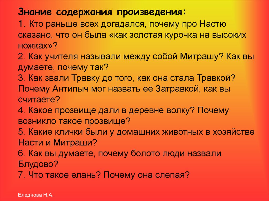 Знание содержания произведения:1. Кто раньше всех догадался, почему про Настю