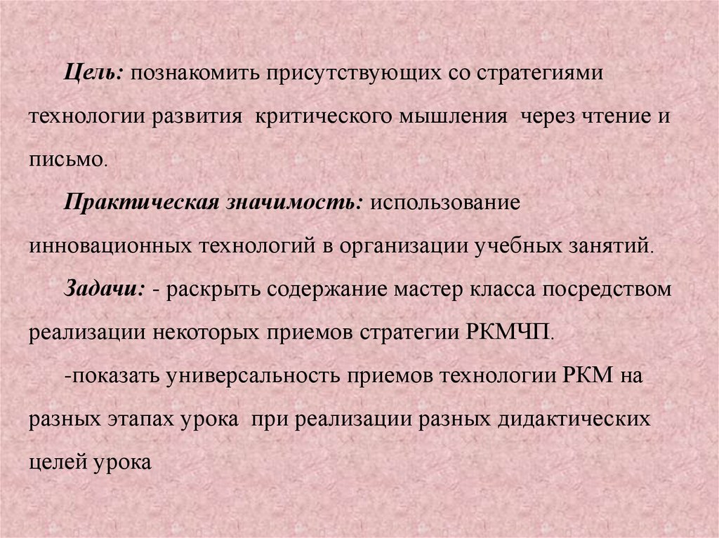 Цель: познакомить присутствующих со стратегиямитехнологии развития критического мышления через чтение и