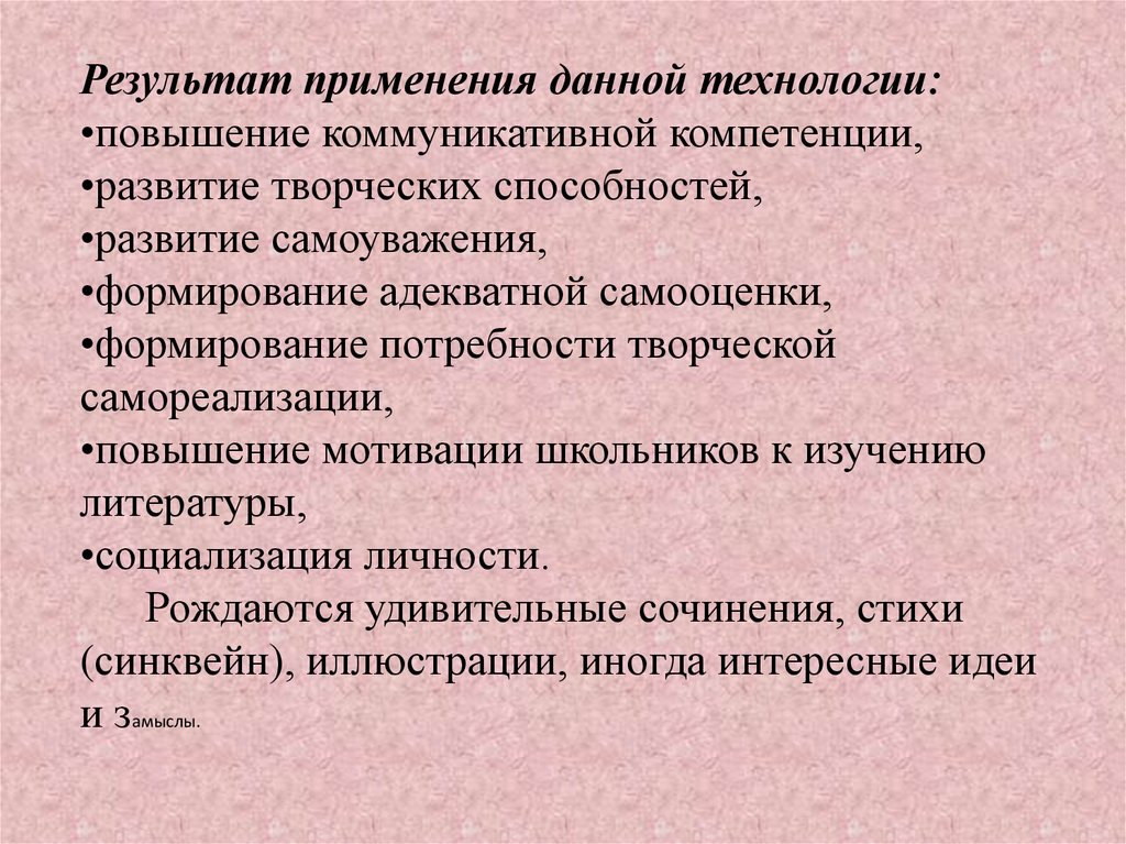 Результат применения данной технологии:•повышение коммуникативной компетенции,