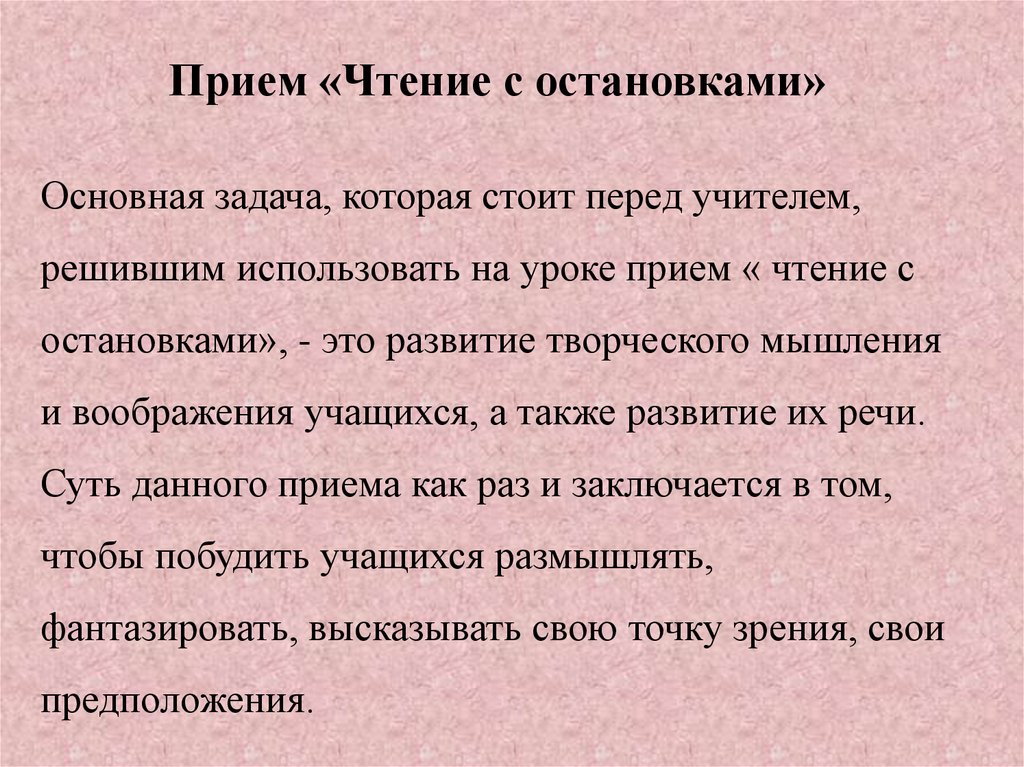Прием «Чтение с остановками»Основная задача, которая стоит перед учителем,